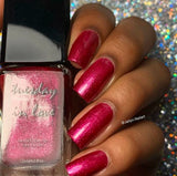 Directions: Shake bottle well for 10 to 15 seconds. Make sure your nails are clean of any oils or lotion. Use a nail buffer to buff your nails. Apply a single layer of Tuesday in Love Basecoat and allow to dry. Apply nail polish in smooth thin strokes. Finish with a layer of Tuesday in Love Topcoat.